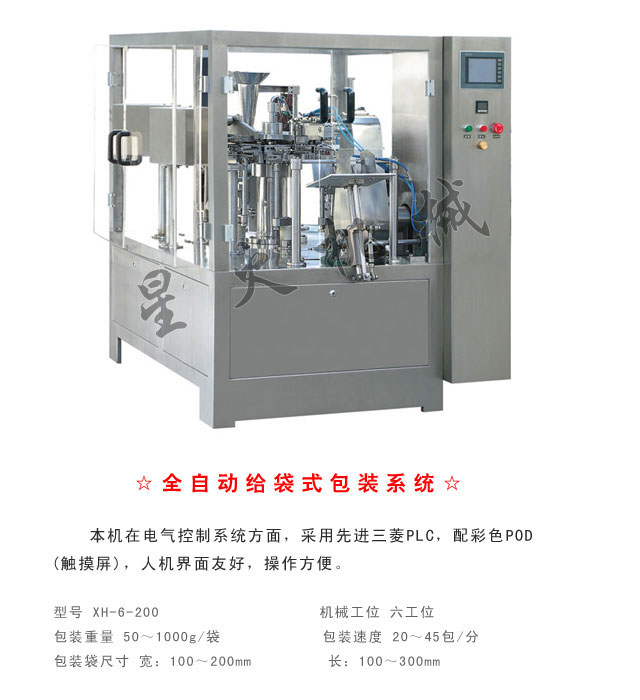 產(chǎn)品關(guān)鍵詞:白糖包裝機(jī)、XH-6/8-200 給袋式粉劑全自動(dòng)包裝機(jī)